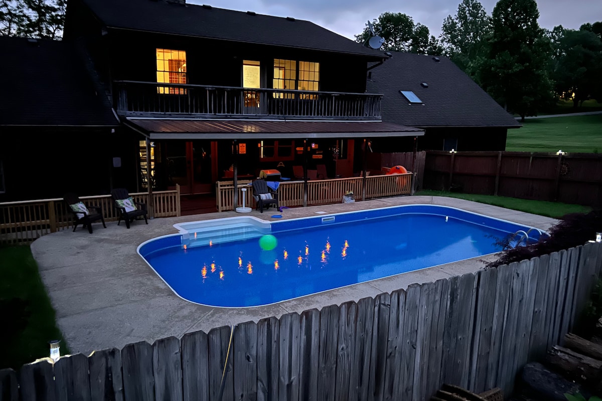 Relax with the whole family at this peaceful country ranch in the heart of the Bluegrass. Sleeps 16 - 5 Bedrooms, 8 Beds, 3 Baths Located just outside of Lexington and only 12 miles from Keeneland. New 7 seat hot tub The solar heated pool is open from April until September. The tree house, swings and trampoline are big hit. Play a game of pool, basketball or corn hole. Enjoy quiet walks around the pond or roast marshmallows around a cozy campfire. Wheelchair access Level 2 EV charger.