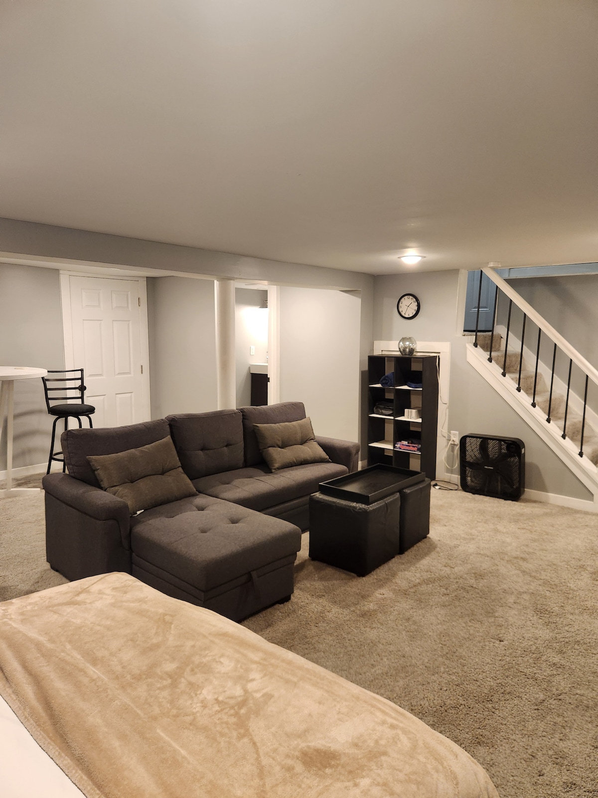 This private Airbnb offers a serene escape within a family home, featuring a private entry and no shared interior spaces. Included is a half bathroom (toilet, sink, mirror…NO shower nor tub). Enjoy the quiet neighborhood from the wrap-around deck, perfect for outdoor dining or gathering around the firepit. Inside, relax with a 55" Smart TV, full-sized bed, and a sectional couch. Great location: 1 mile to Kenwood Mall, only 20 minutes to downtown Cincinnati, and 17 minutes to Kings Island.