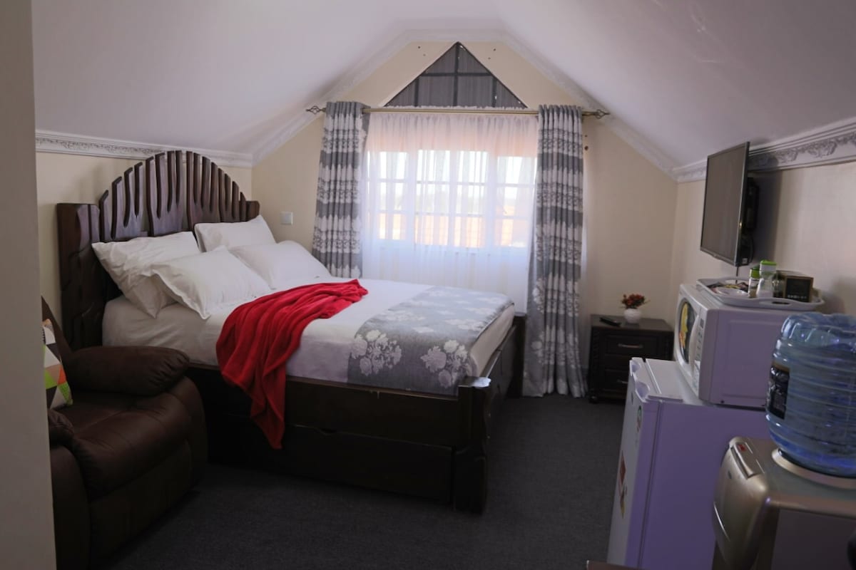 Hawas Loft is a beautiful spacious penthouse located on the hillside of Kiamunyi estate, Nakuru county,100 meters along the busy Nakuru-kabarak road. The cozy short-term rental has three bedrooms all ensuite with a spacious shared living room and kitchen. The accommodation offers a panoramic view of Lake Nakuru on your left, gentle slopes of Ngata Estate on your right and a posterior view of the Menengai Crater. Amenities include a patio with 24 Hours CCTV, WIFI and Ample Parking.