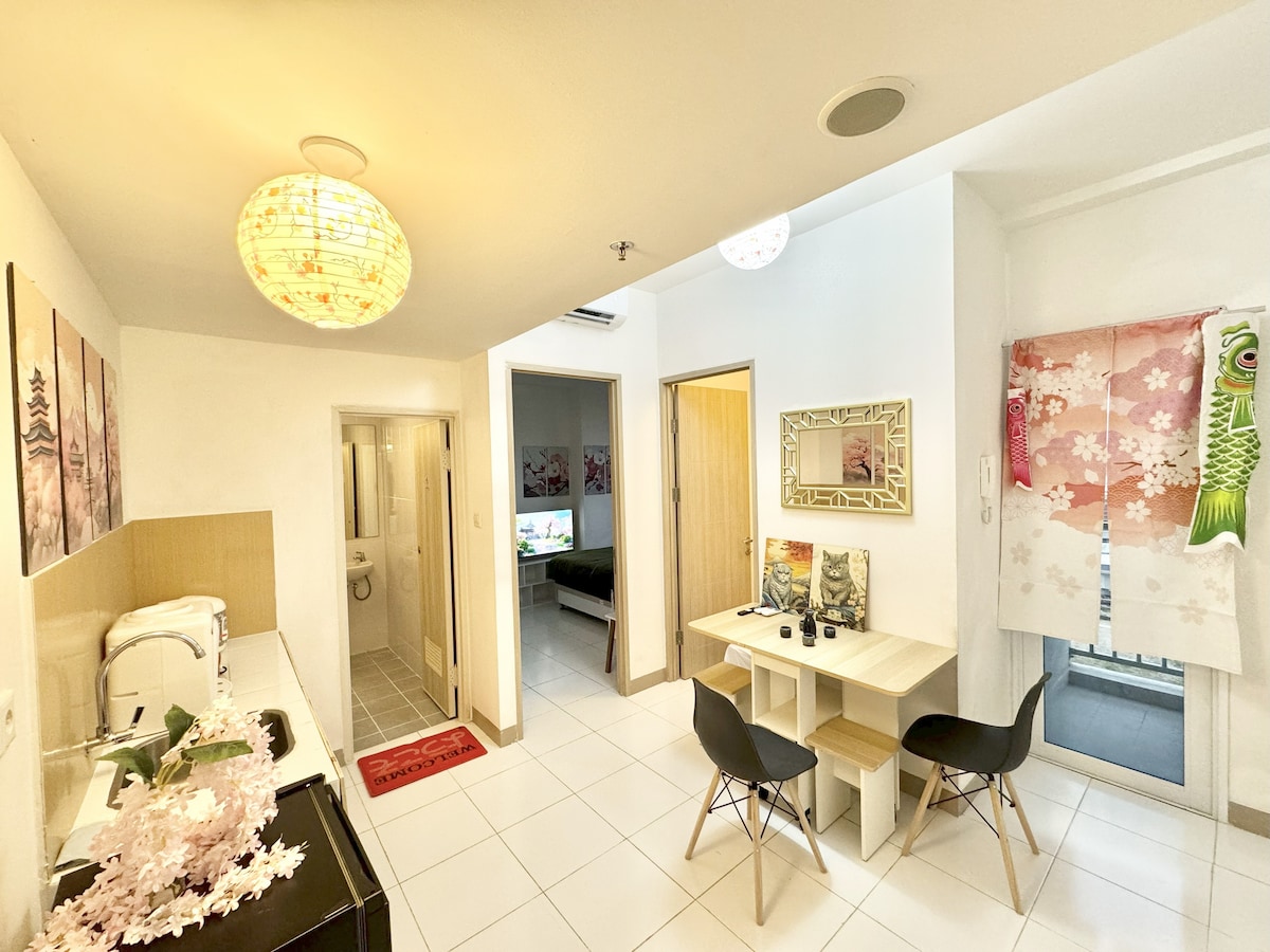 Tokyo Riverside studio apartment in PIK 2 (TOWER ISHIKAWA), close to dining spots and NICE (Nusantara International Convention Exhibition). Fully equipped with bedroom, kitchen, bathroom, and Wi-Fi. Ideal for solo travelers, couples, or small families.