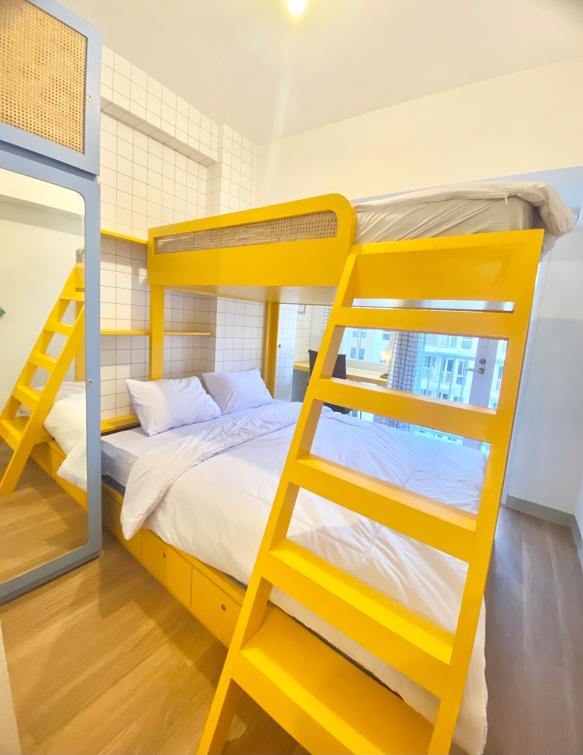 Have fun with the whole family staycation at this Japanese Theme Apartment. We located in Tokyo Riverside PIK 2 6 Bed Room 4 Bath Room Hot Shower IMPORTANT PLEASE READ: This is 2 Unit of 3 Bed room Each unit have 3 Bed Room and 2 Bath room with similar setting: 2 Bed room with con and big bed for 2 person each, 1 Bed room WITHOUR Air Con for 1 person, this room get the aircon from the living room. so each unit for 5 pax we have 2 unit so total 10 pax.