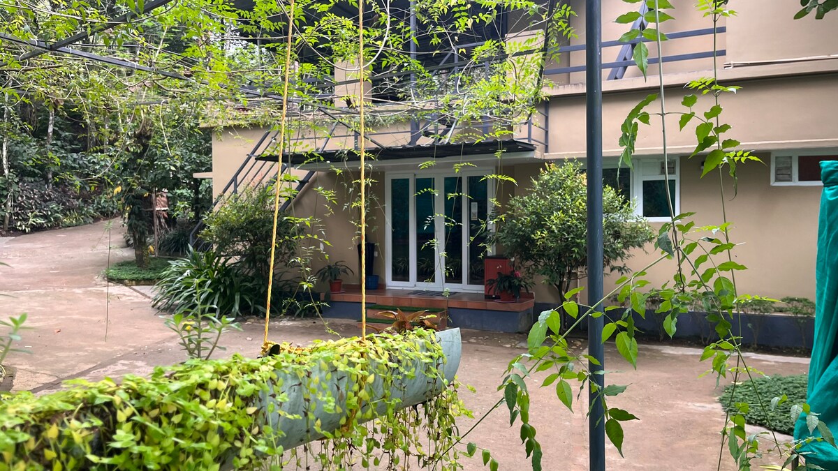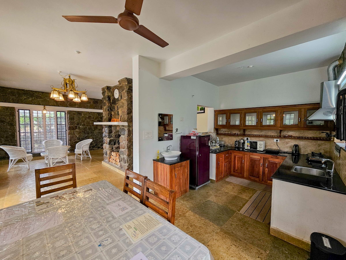A serene house in a coffee plantation with 3 rooms, each with attached bathroom. Enjoy balconies with scenic views and a vast activity areain the first floor with indoor games like chess ,carrom,foosball. Fully equipped kitchen; campfire & barbecue available on prior request. Perfect blend of nature, comfort, and fun!