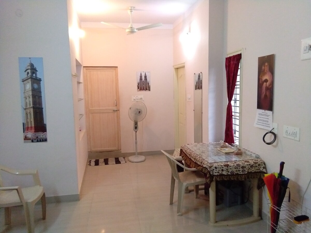 First floor , One Air Conditioned room ( extra charges based on actual AC usage ) with 2 cots and Sleepwell mattress , with private bath , 24 hours hot water, UPS battery back up for lights and fans only (for about 4 hours), Fiber WiFi , fridge , small kitchenette with single burner lpg stove, few utensils , electric kettle,washing m/c , EV charging point.