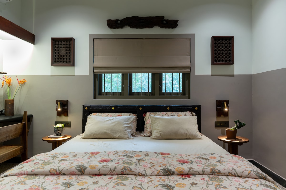 This self-catering cottage has a bedroom, kitchen and attached bathroom. With exposed brick walls, antique wooden furniture, and hand-painted tiles, Ivy Cottage is delightfully shabby chic. Rustic and yet luxurious, the decor reflects local tribal culture and the animals of the Nilgiris. An entire wall of floor-to-ceiling windows looks out on a private patio, gardens, and a stunning view of the Nilgiris mountains. Breakfast is included.