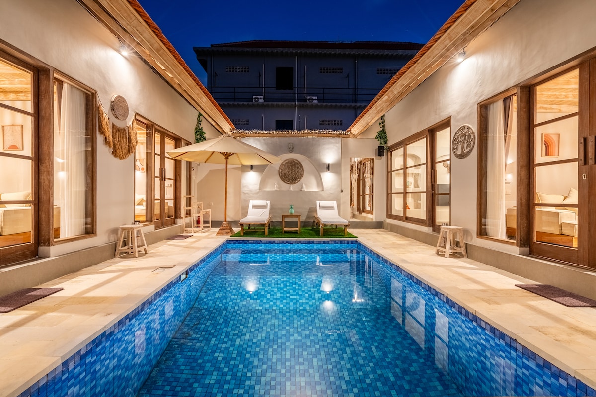 Boho Majipso is a peaceful villa with 6 independent private suites, sharing two swimming pools and a shared kitchen and relaxation lounge. Located among rice fields in a quiet area of Canggu, it offers a calm and respectful atmosphere. Each suite has a private bathroom and fast, reliable Wi-Fi, ideal for remote work. Digital nomads enjoy 2 hours of free daily coworking at the nearby Puco Rooftop, plus special discounts on extended hours and food. Perfect for long stays and slow Bali living.