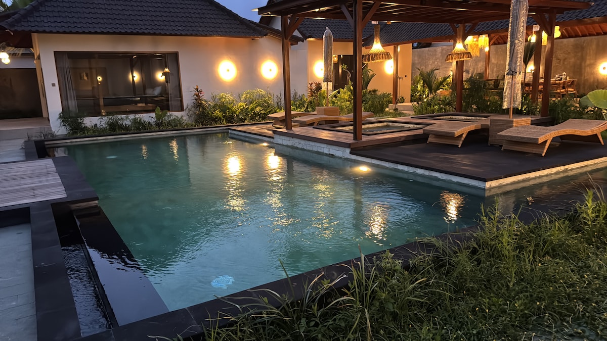 Luxurious private villa with 6x3 meter pool. Secure, private, safe. Lush garden and sheltered but open air kitchen for dining and relaxing by the pool. Queen bed, outside tub and shower, with fish pond view, fully equipped kitchen. AC, TV, great WiFi, daily cleaning and set breakfast is included. We are an 8 minute walk from the main road, or a short scooter ride. This means peace and quiet, and no car noise. Our staff will be happy to drive you in by scooter if needs be.