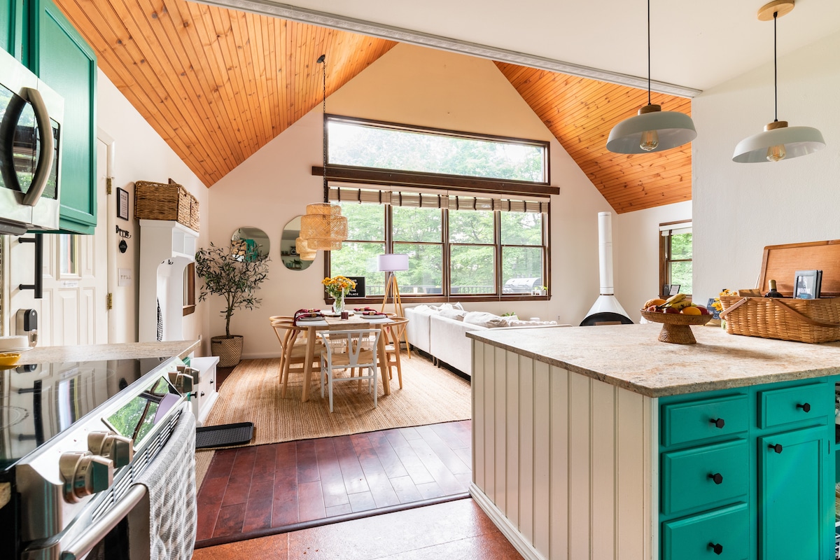 Escape just 2 hrs from NYC to our dreamy mountain facing A-Frame cabin in the Catskills foothills. Close by you can Hike some of the most beautiful trails, Swim Waterholes, or even climb waterfalls, and explore charming towns, farms & breweries/wineries by day. By night, grill on the overhanging deck, stargaze by the firepit, watch a movie in the cozy cinema/game room or soak in the hot tub under the stars. A magical retreat for couples, families & friends to relax, play, and reconnect