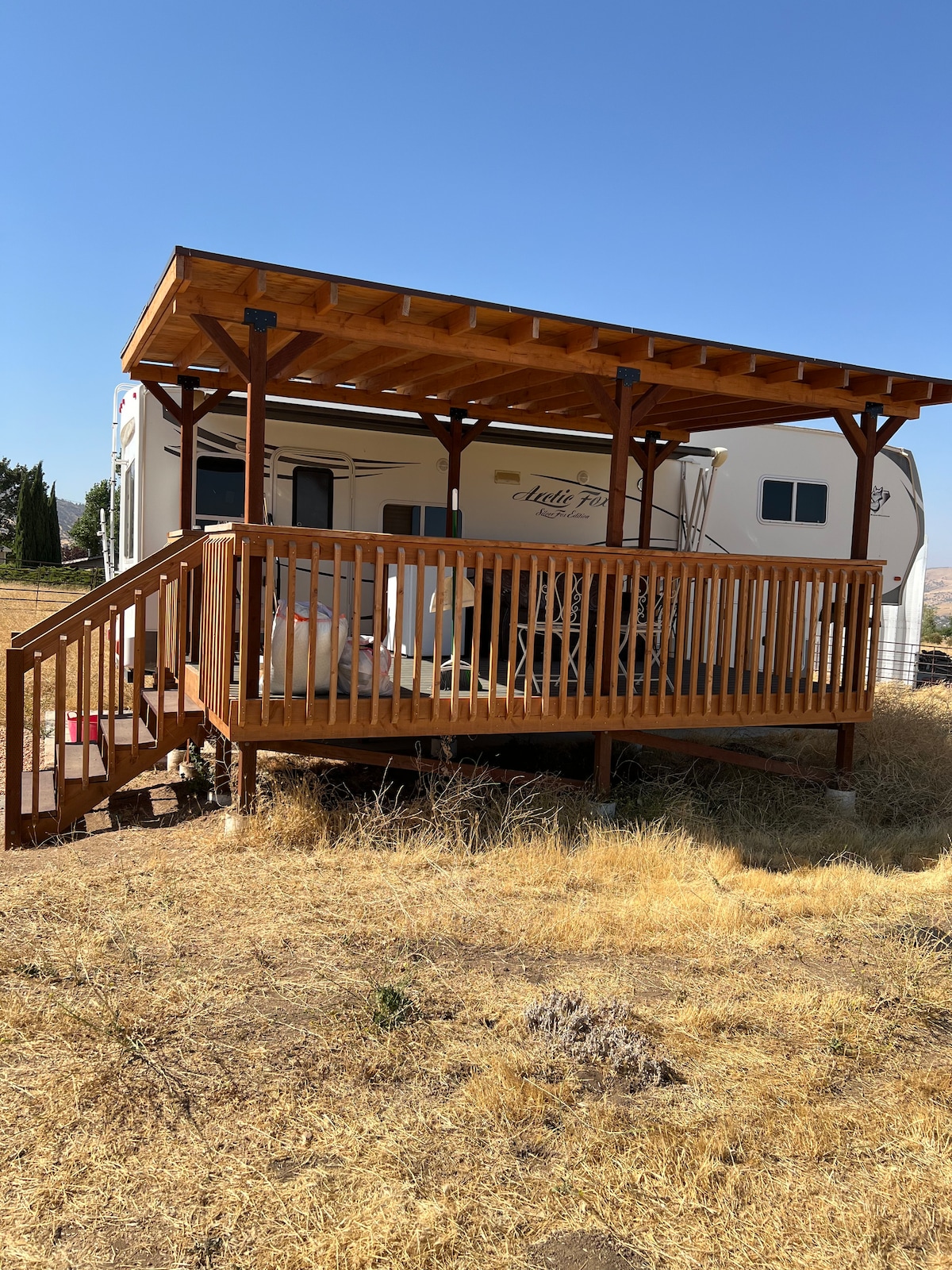 A gorgeous 5th wheel guest quarters with peaceful and happy energy on 3 acres with views yet only one mile from all the conveniences of markets and restaurants. You can watch playful deer or simply relax. It has everything... stove. fridge pots dishes and large shower with hot and cold water.