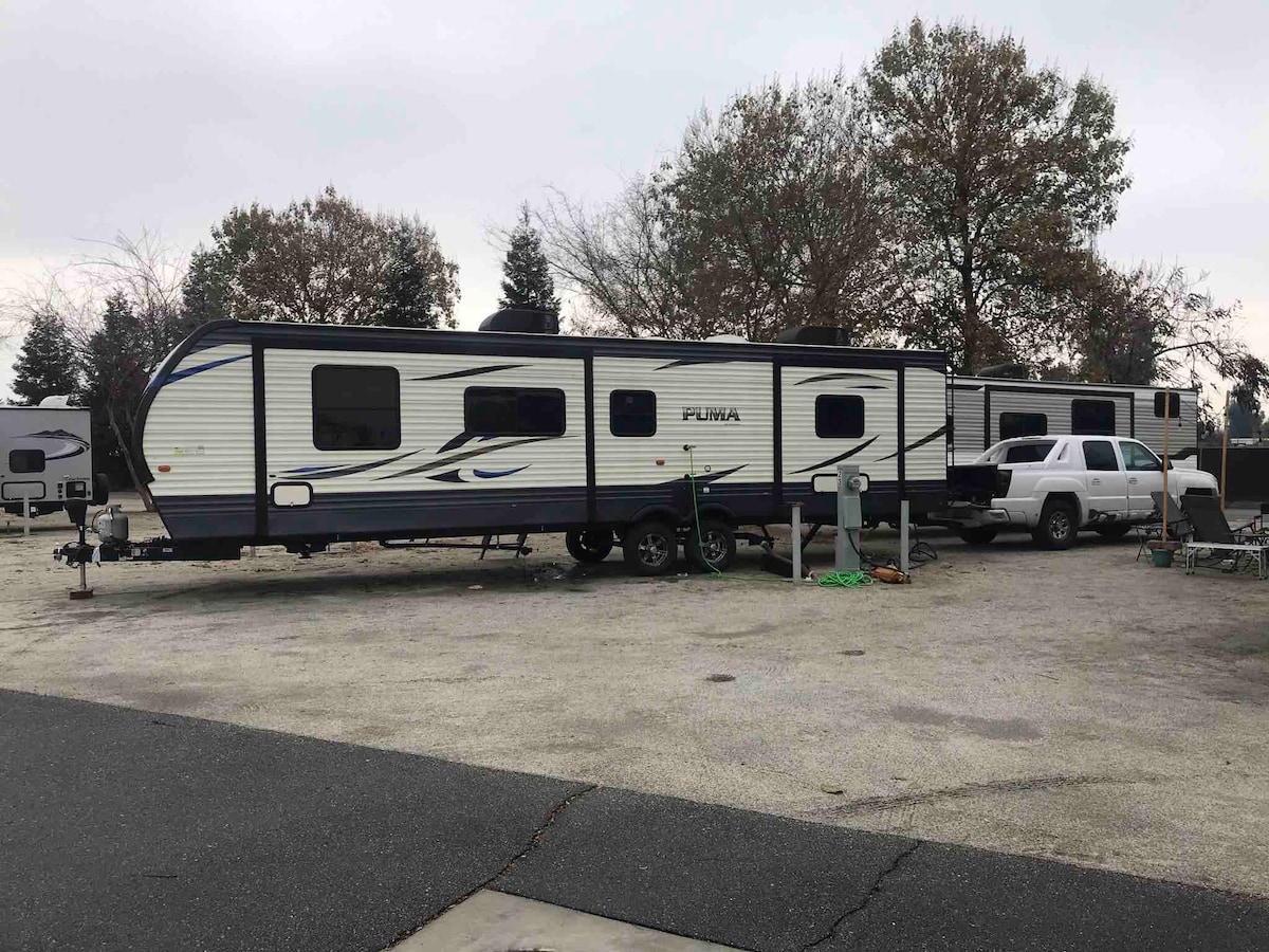 Retreat and unwind at our cozy camper after a day exploring the city or hiking in Sequoia/Kings Canyon National Parks. You will enjoy a fully equipped camper with a full bath, kitchen, dining space, and 76" queen bed. Indulge in a movie or TV show on the pull-down projector screen from the comfort of bed! The overhead A/C unit will help you beat the heat as you relax in the comfort of the camper. Message if interested in staying over 30 days. See pet policy under "Additional Rules." No smoking.