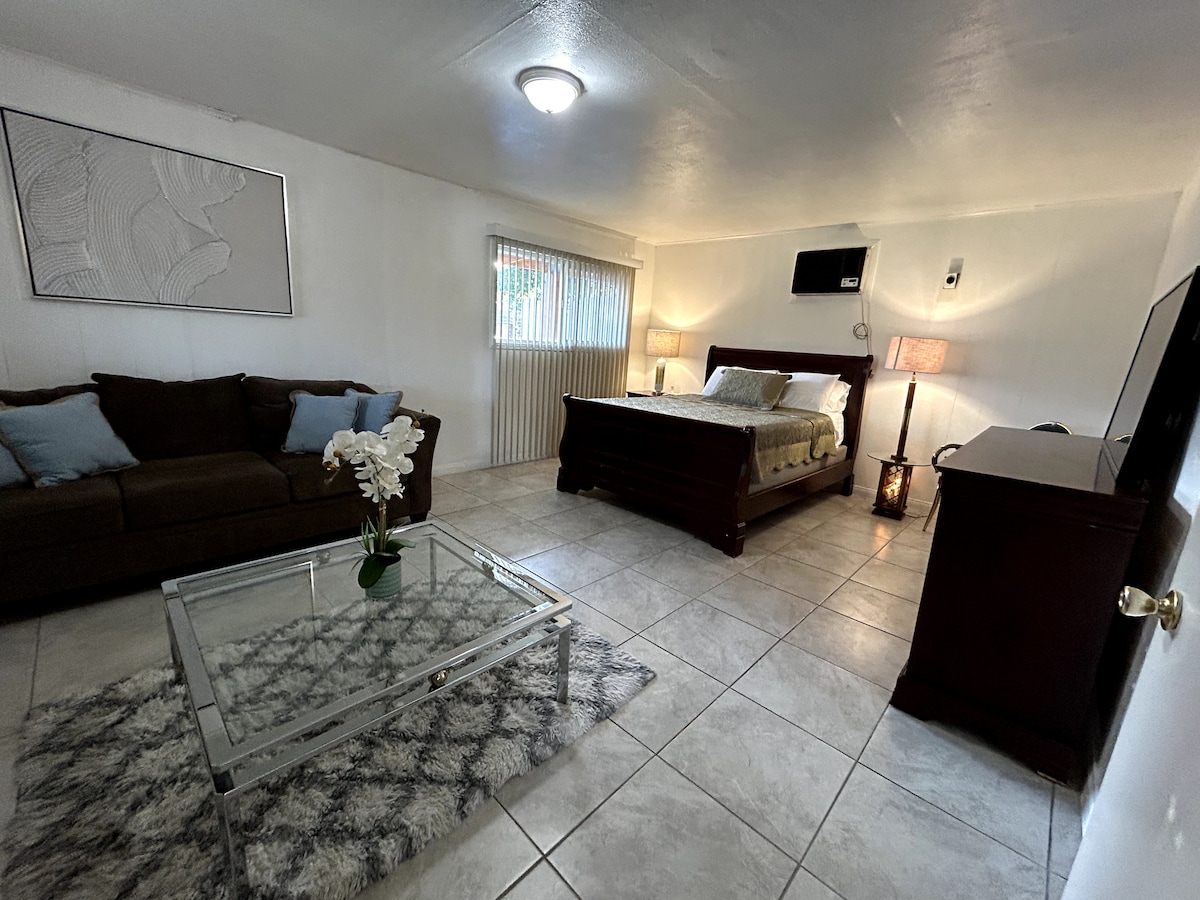 River's Edge Cottage, a lovely riverfront property by The Kern River House. Unique spot on Kern River with Private River Access & epic vistas of the southern Sierra Mts. Meet the river as soon as you arrive! The large modern suite is perfect for 1 couple or small family. With a full bathroom, kitchenette, wood fireplace, cozy lounging nooks, propane BBQ, garden terraces, large dining patio, steady WiFi & fully gated property, you'll have everything you need to enjoy your riverfront stay.