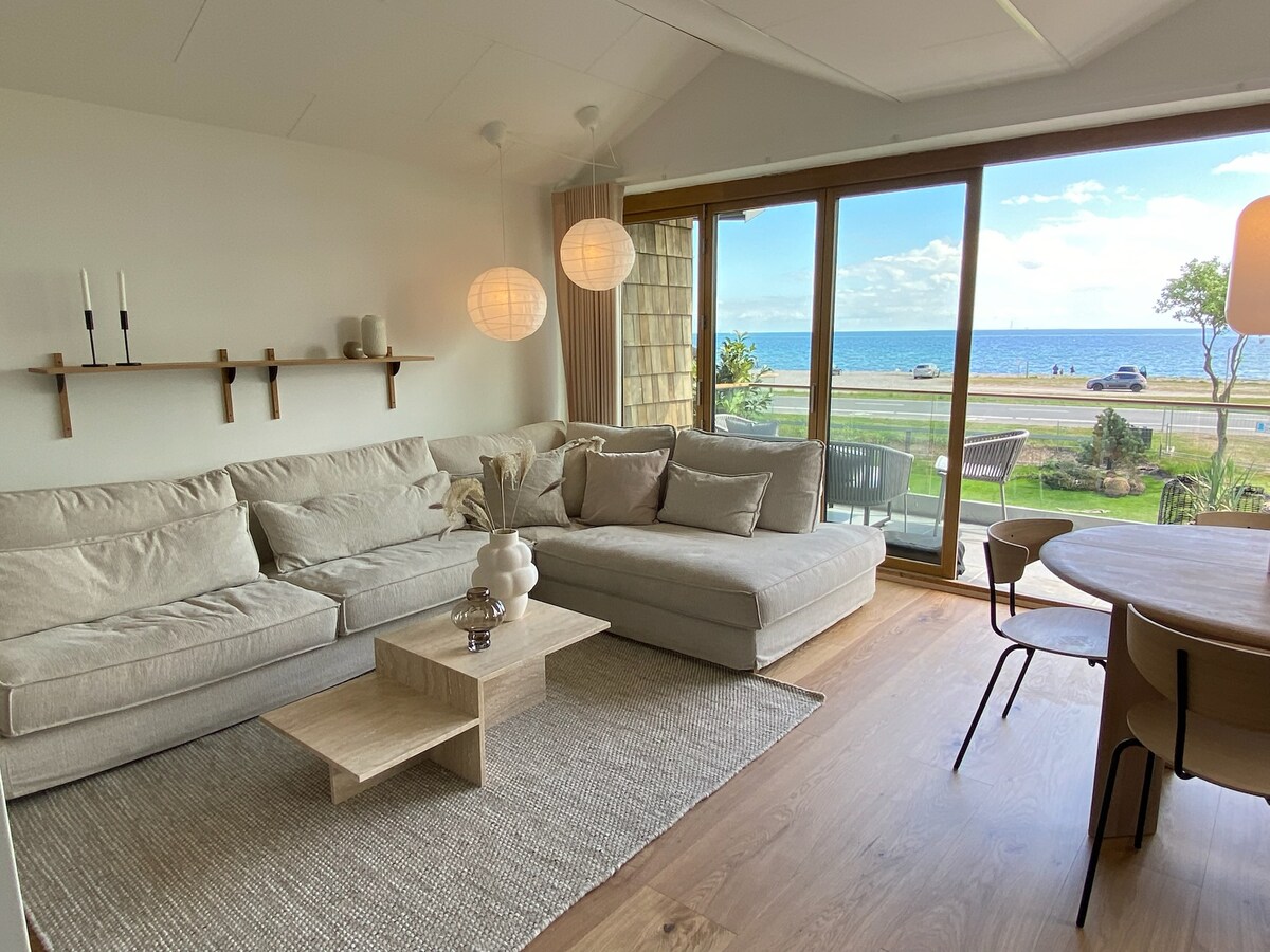 Et stenkast fra stranden ligger den nyopførte ferielejlighed. Fra den rummelige terrasse er der en storslået panoramaudsigt over stranden og bugten. På en klar dag ses Storebæltsbroen tydeligt i horisonten. Det ene soveværelse er udstyret med separat glasparti mod stuen, så du kan nyde havudsigten mod øst uden at stå ud af sengen samt eget badeværelse. Derudover er der et soveværelse mere, et værelse med sovesofa og et badeværelse. Sengene er opredt og der er viskestykker, karklude & håndklæder.