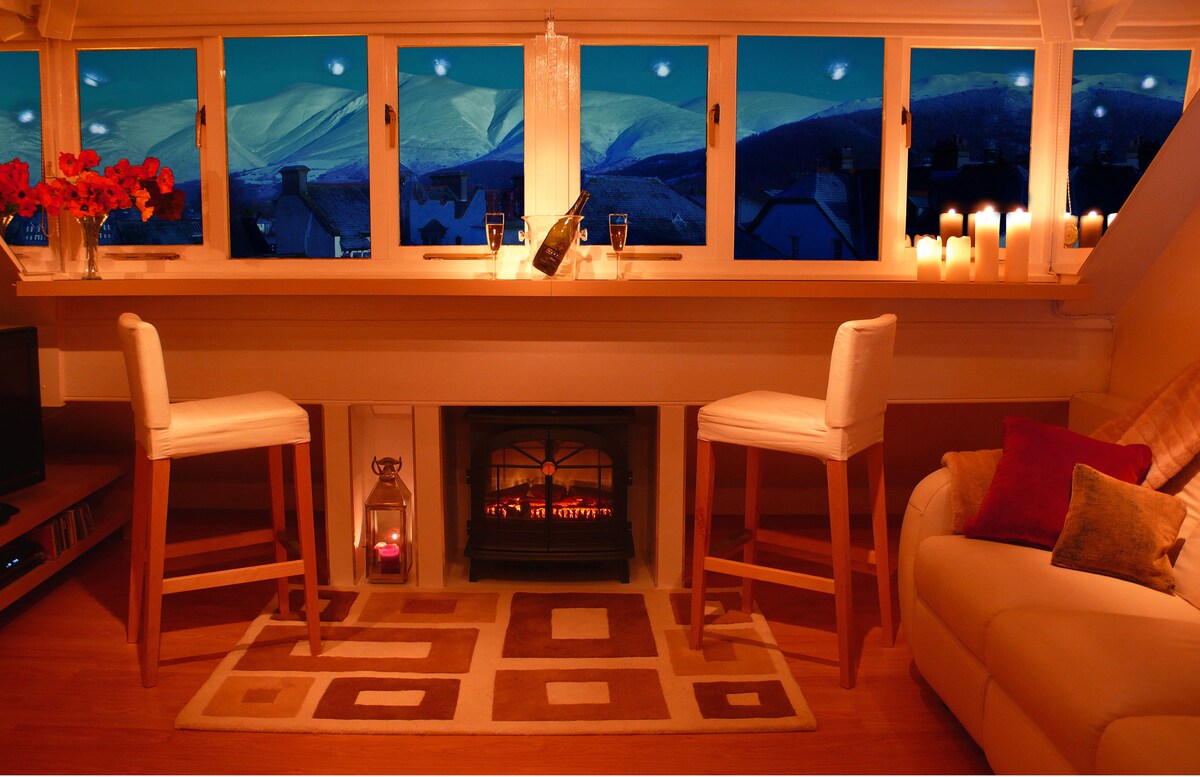 The Views “The Penthouse" is a modern studio apartment in the centre of Keswick just off the Market Square. A parking permit is included allowing FREE use of the town car parks. It is on the top floor (that's why we call it The Penthouse) giving amazing 270 degree views over the roof tops of the surrounding mountains. From the living room there are outstanding views over the town and of Skiddaw and Latrigg. And of Derwentwater, Borrowdale Valley and the surrounding mountains from the kitchen.