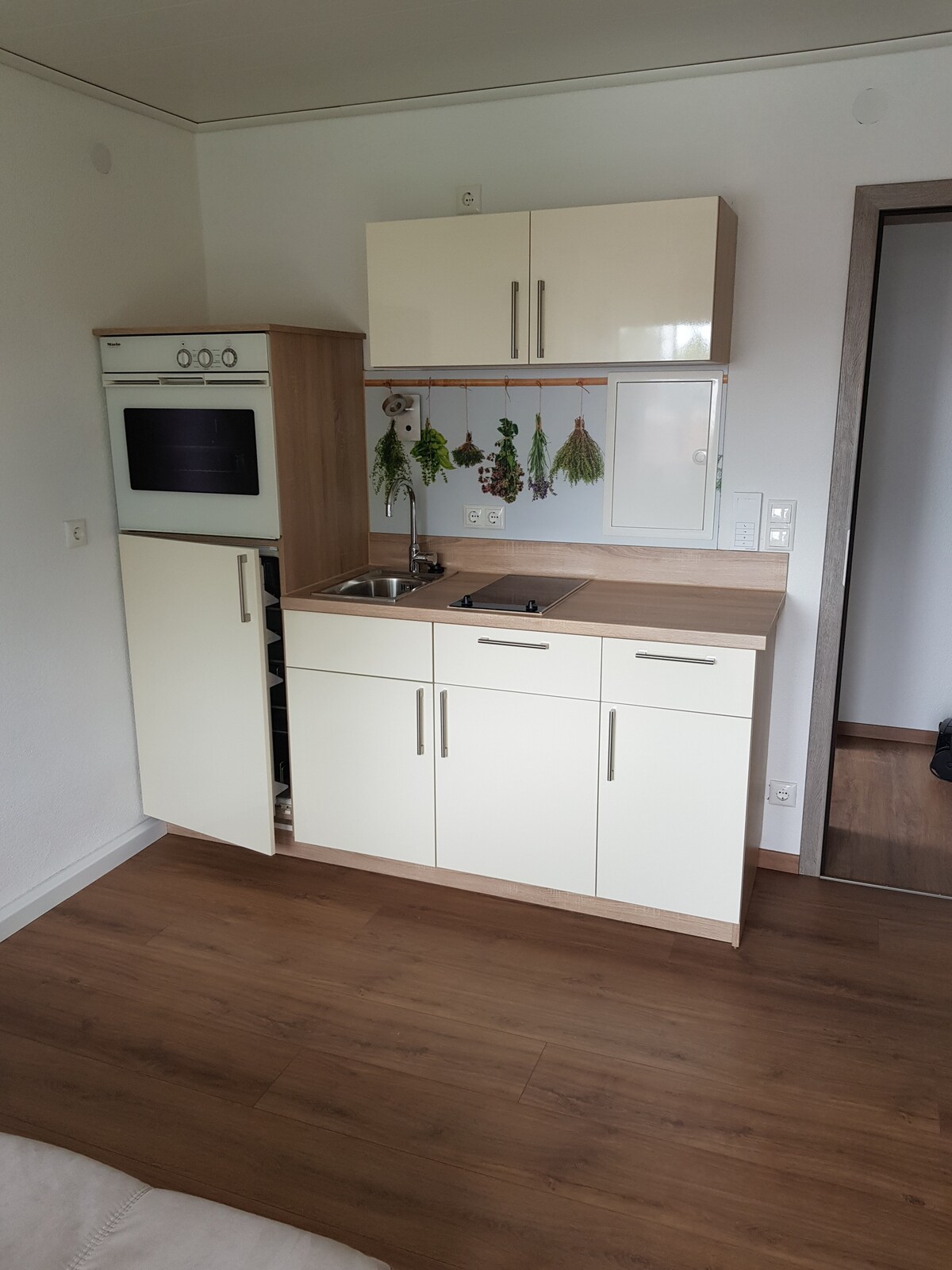 Ein freundlicher, offener Wohn- und Schlafbereich mit Küchenzeile, Esstisch sowie separatem Schreibtisch, lädt zum Wohlfühlen ein. Das Bad ist mit Dusche, Waschbecken und WC ausgestattet. In der modernen Küche findet man alles Notwendige: Senseo-Kaffeeautomat, Wasserkocher, Cerankochfeld, Backofen, Mikrowelle, Kühlschrank, Töpfe, Geschirr usw. Sollte etwas fehlen, darf man sich gerne melden .