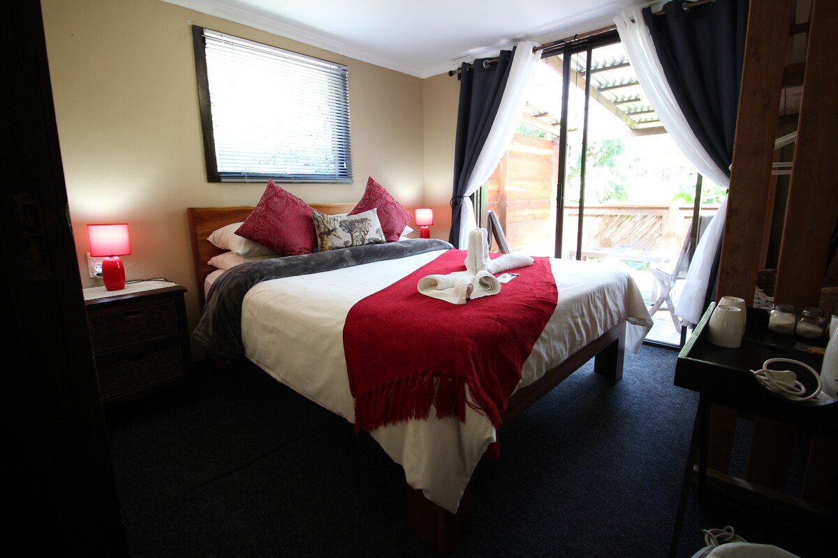 Escape to a beautifully designed, en-suite haven perfect for a romantic getaway or peaceful solo retreat. Our charming space comfortably accommodates two guests, offering a serene and stylish environment to unwind. Located on a picturesque island in the Keurbooms River, you'll enjoy stunning natural surroundings. The thoughtfully designed interior combines modern comfort with elegant touches, ensuring a relaxing stay.