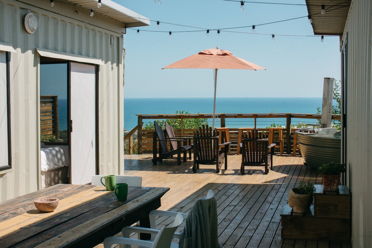 Simple, light , warm, north facing converted 12 m container. Nestled on a 6 hectare headland with unparalleled views of the ocean and stunning Outeniqua mountain range. Close to rivers, lagoons, ocean and indigenous forest. Paragliding paradise with a registered site on the property. Decades of local surf knowledge and experience. Happy to point you in the best direction to score something special! We have an abundance of fantastic spots!