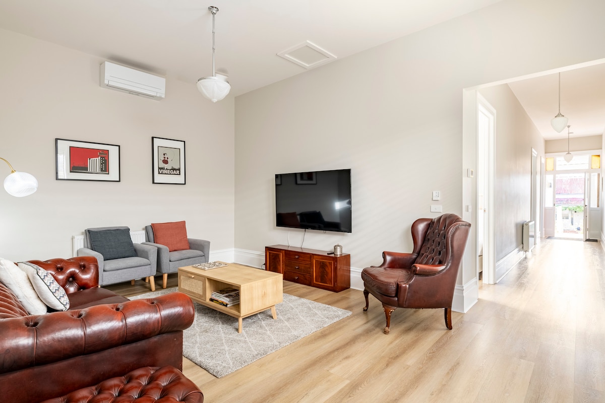 Edwardian semi detached renovated home in Kew, Quality furniture and fittings. 6km E CBD. Free OSP 2 cars 2 lge brms, Miele kitchen. Open family, dining rm. Bathrm with bath & sep't shower. ctyard with bbq & outdoor table. Additional sofa bed in lounge room Video intercom, ducted heating & air con. 2 x 55" OLED TV’s,Netflix, Disney+ Ultrafast Wi-Fi , P.S 4, Cot, highchair Suits 4-6 guests,only 1 bathrm & toilet