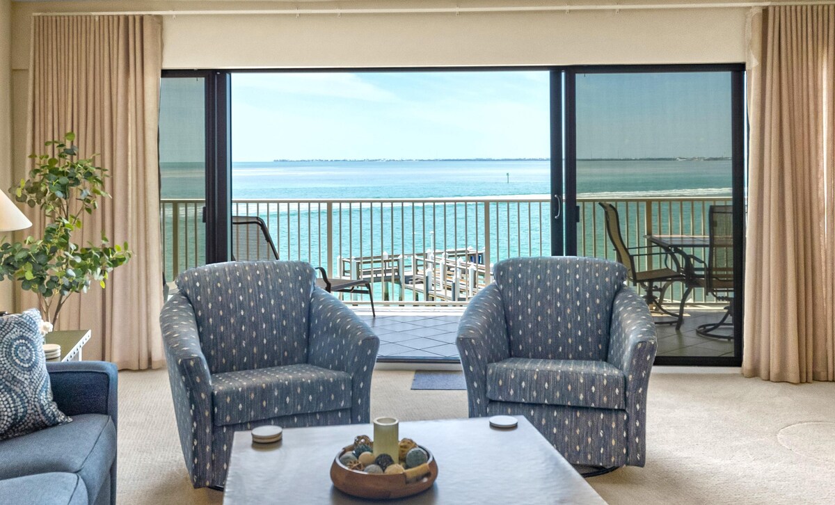 This premier unit and spacious 3-bedroom, 3.5-bath Villa offers Gulf sunset views from the porch and balcony. It is one of the most renovated units at Indigo. Each bedroom has its own TV, plus a large flat-screen in the living room. Private boat dock accommodates vessels up to 35’ in length, draft not exceeding 3’. Boaters insurance required. Multiple vessels or personal watercraft are not allowed in a single dock space. Accommodates up to 6 guests (Note: Minimum weekly rental. Stairs required.)