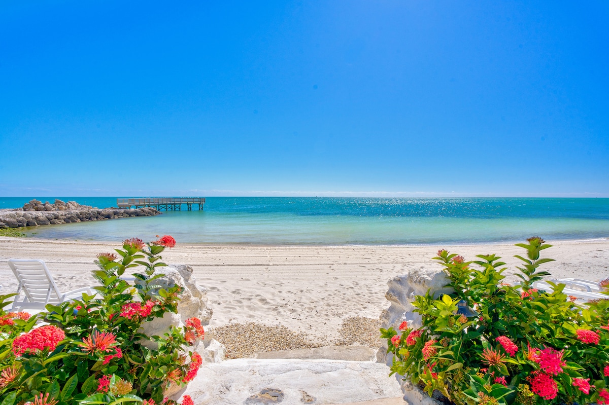 Exquisite renovation just completed (Nov 2024). Unobstructed ocean views from our beachfront condo in Key Colony Beach. Ground floor and just a few steps away from our private beach and heated pool. Location just does not get any better. Stunning, clean white interior - kitchen stocked with everything (dishes, cookware, utensils, glassware, stove, oven, toaster, microwave, blender, fridge, etc). Guests can enjoy the quiet private beach with lounge chairs, patio tables, tiki's and BBQ grills.