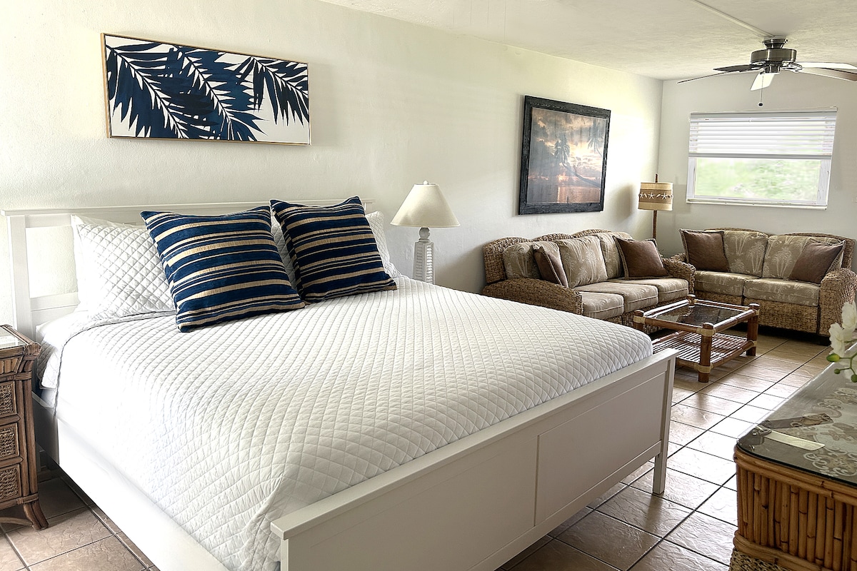 Studio unit with fridge, microwave, settings for 2 and a king sized bed. Doors that open to a balcony overlooking the Atlantic Ocean. There is pool, hot tub, and a private sandy beach on the Atlantic ocean. 5 minutes walk to Duval street. The resort is located between the prestigious Casa Marina and the top restaurant on the island Louise Back Yard. There is free garage parking with the room. Washer, dryers and ice maker are available for guests. Powerful, but sometimes noisy air conditioning.