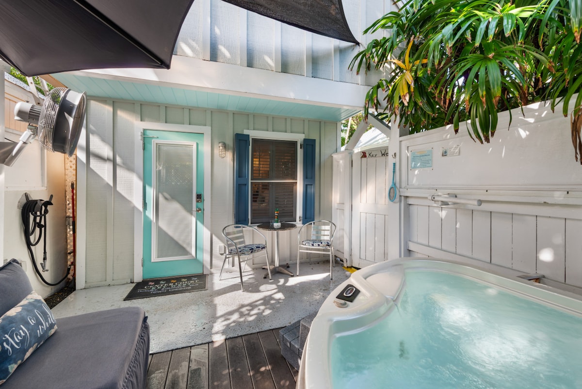 Historic Harrison's Hideaway is in an 1880's Cigar Maker's cottage renovated in 2010. It features a K size Pottery Barn memory foam bed, custom made full sleeper sofa, renovated kitchen with granite counter tops, 2 burner stove, under counter fridge/freezer, dishwasher, microwave, air fryer/oven tumbled marble 2 person shower, private front deck with seating for 4, 2 person Solana spa. Perfect for a couple or a family with children. Freshly painted a Caribbean blue with plantation shutters.