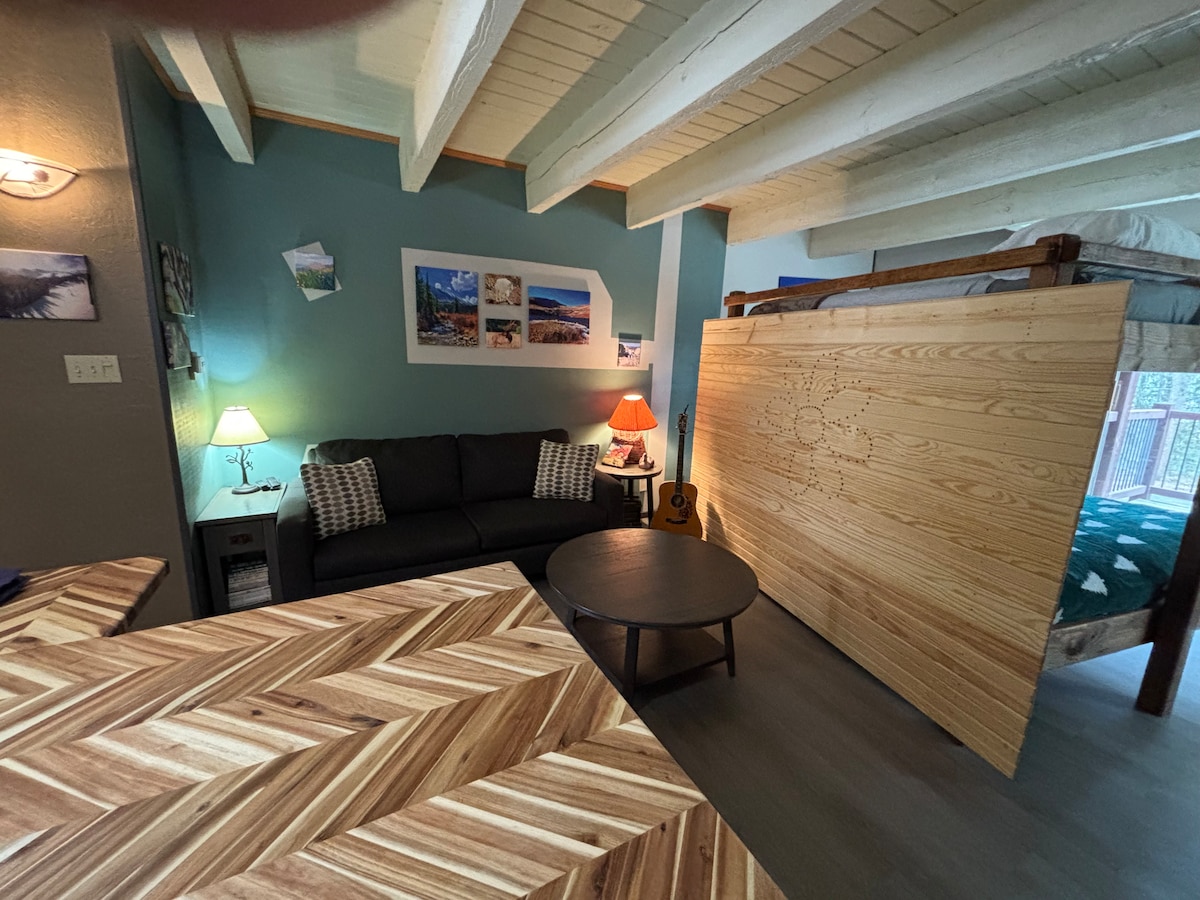 Base your mountain adventure out of this ideal location just off the Main Street of the Rockies. Frisco Central #2 (The Tap Room) is a studio unit in a custom crafted lodge. One of the most photographed properties in town. This fun, funky, artsy, location took 7 years to build using mostly reclaimed material. Feel like a local when you stay in Frisco's finest. This 400 sq/ft studio is on the 2nd floor and sleeps 2-3 with full bath, kitchenette and shared deck.