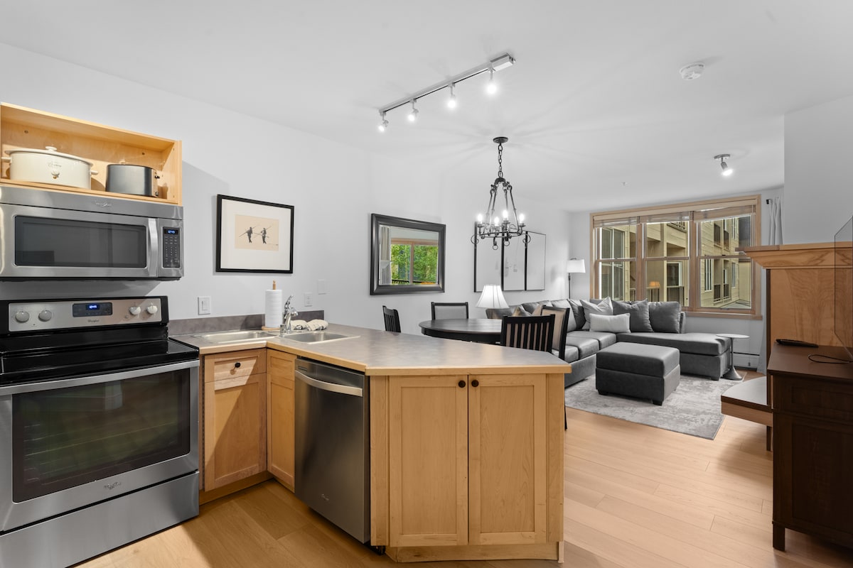 Please note. Early check in/Late check out not available. Kick back and relax in this calm, stylish space. Our warm and welcoming condo is nestled in a quiet but convenient area very close to lifts and town. Cozy up to the gas fireplace, Relax on the covered deck Adirondak chairs with coffee or a cocktail. Use the provided robes to take an easy stroll to the pool and hot tubs after a day of skiing or hiking. Mountain luxury is just a click away!