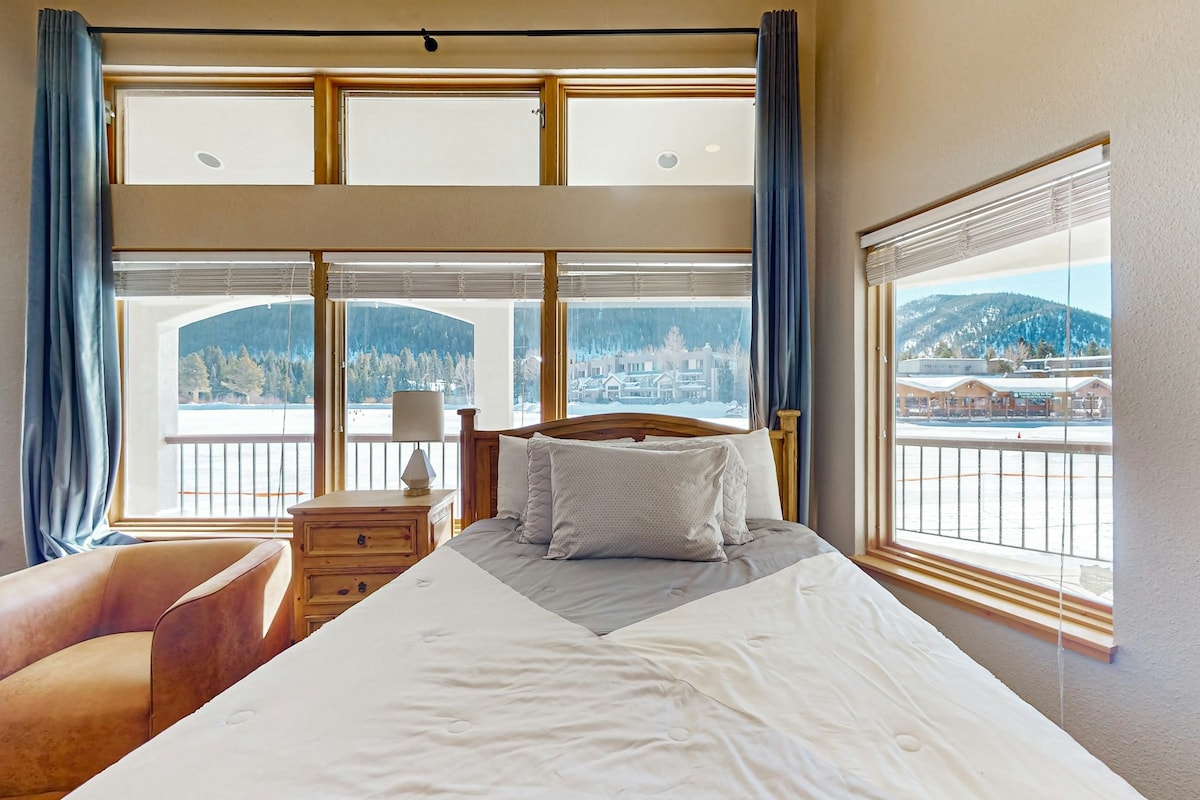Comfortable pet friendly studio in Keystone. Studio has a gas fireplace, WiFi, TV w/ cable & streaming, free heated garage parking, elevator, & free shuttle to the slopes. Located steps to hiking trails, bike path, & the Snake River. Located on Keystone Lake w/ ice skating in the Winter, & water activities in the Summer. Enjoy the amenities which include 2 hot tubs, large heated indoor/outdoor pool, steam room, sauna, spa w/ services, & fitness area. Awesome location for any season!