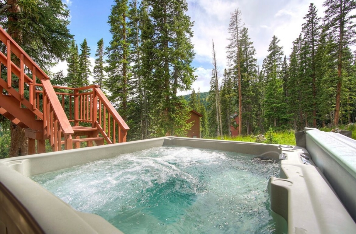Wake up every morning to a mountain wonderland when you stay at this three-story cabin. This cabin boasts unrivaled vistas views over the snowy peaks of the Ten Mile Range. You may even spot a moose meandering between the pine forest. This luxurious home offers a modern take on the quintessential American log cabin. The beams’ honey tone paired with atmospheric chandelier light creates a cozy vibe. There’s a spacious open-plan living room kept warm by a wood-burning stove.