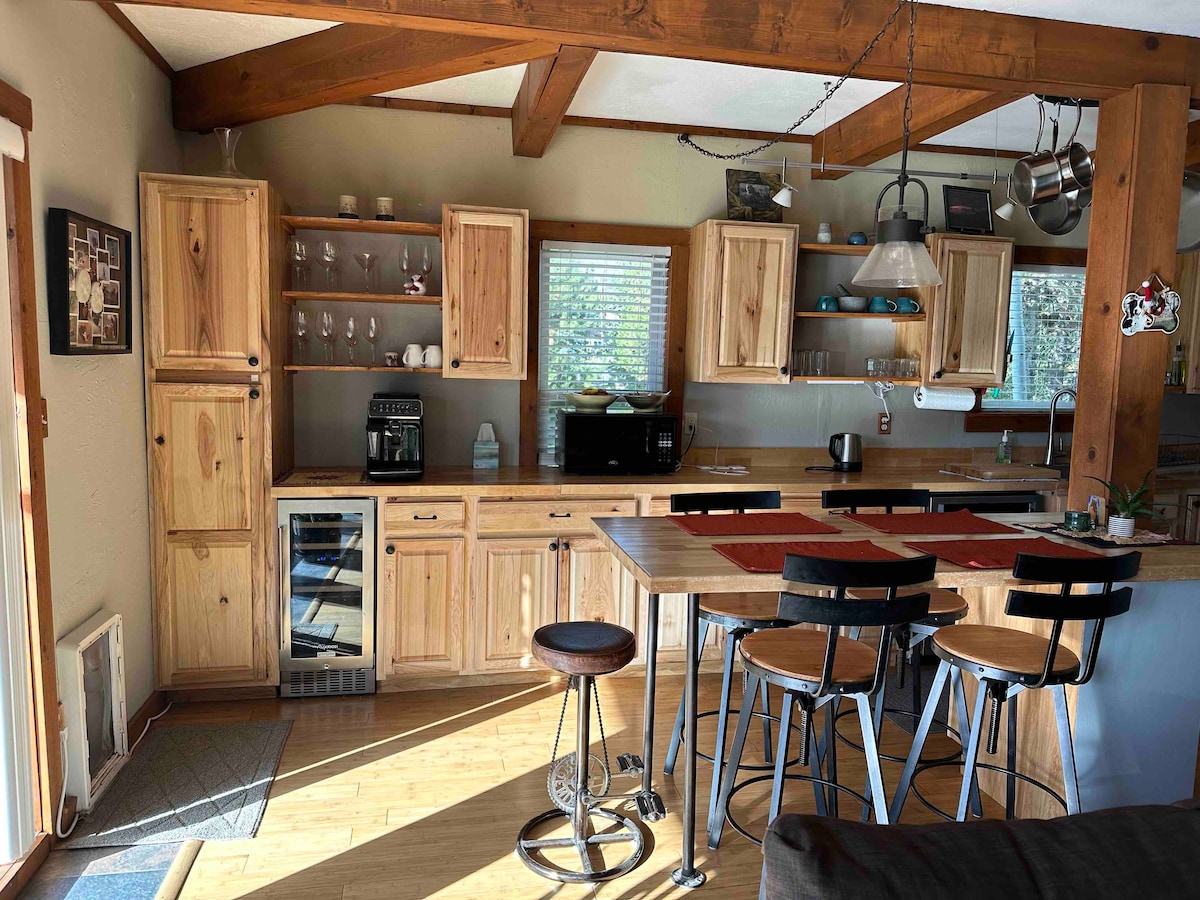 Discover the charm of our 4-bed, 2.5-bath family and pet-friendly home. Enjoy cozy nights indoors by the gas fireplace and entertainment with a foosball table and flat-screen TV. The fully-equipped kitchen and dining area make meals a breeze. Upstairs, find comfortable sleeping arrangements for 8 guests and pet companions. A washer/dryer adds convenience. No AC up in the mountains. The serene surroundings make for a delightful getaway for families or friends seeking a relaxed vacation.