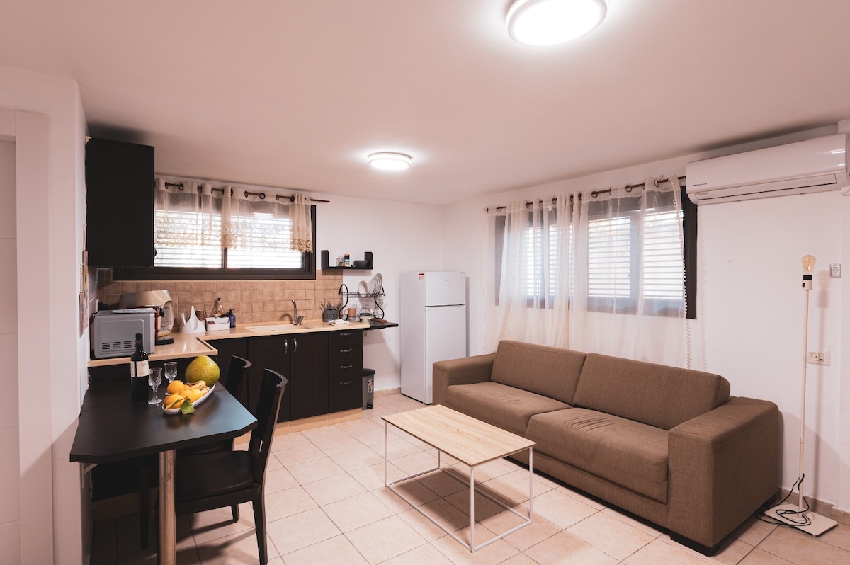 Quiet garden suite on the ground floor in Tel Aviv Enjoy a calm stay with direct access to a neat garden with table and chairs — perfect for relaxing in the city. Ultra-fast fiber-optic internet 📶, powerful air conditioning, smart TV with many channels. Fully equipped kitchen, neat bathroom, washer and dryer in the garden. Free street parking nearby 🚗 and a shared, well-equipped bomb shelter 5 meters away. Ideal for couples, solo travelers, and business guests seeking comfort.