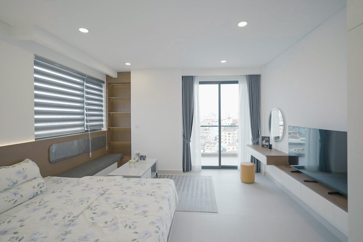 Our studio is on the upper floor with a large balcony to enjoy fresh air and the beautiful city view. Our space is perfect for all travelers, with a special focus on remote workers seeking a comfortable home away from home. Located in Toul Kork which is the center of the city surrounded by cafes, restaurants, local markets, super markets, bus stops, train station, and other tourist sites. Just 5 mins to the shopping mall and dining centers Eden Garden.