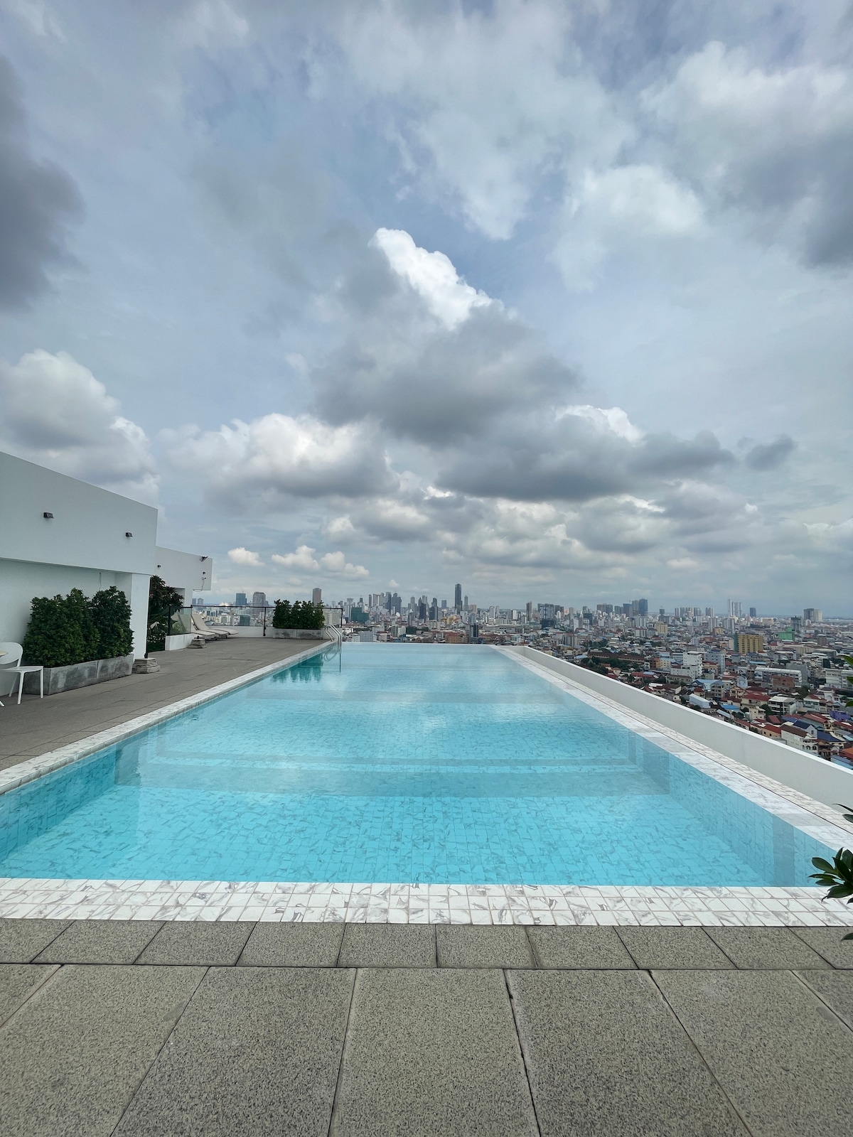 Modern studio condo unit in central Phnom Penh. Fully furnished with a comfy king sized bed, sofa, full kitchen, spacious bathroom, and a large balcony perfect for cozy night in. Enjoy the rooftop gym & pool for free on the 26th floor with stunning city views. Secure building with card access. Just 3–4 km from city attraction, like Russian Market, Central Market, Royal Palace, Independence Monument, etc.