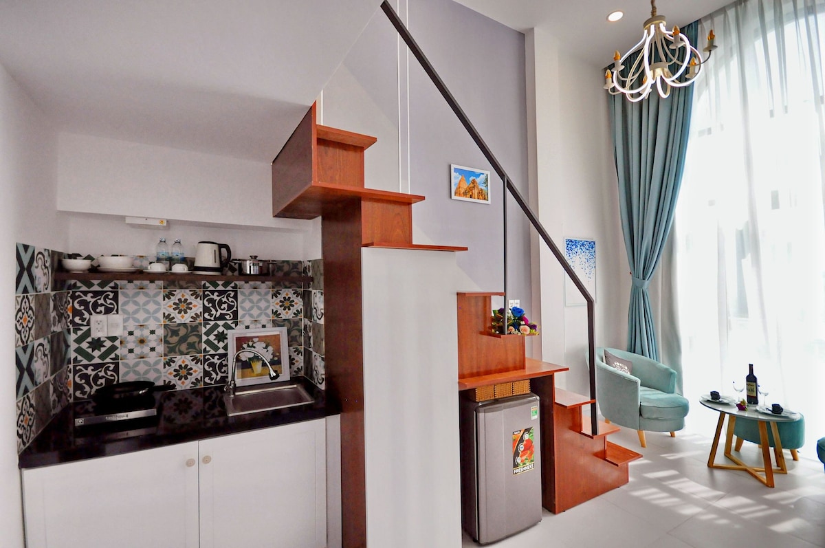 This room is 35m2 (including the upstairs area) and is equipped with full furniture including a private restroom and kitchen set. The utility bills are included in the renting price. The house is next to a cafe and a gym. It is close to the supermarket and market (200m) and the sea (300m). There is a big courtyard in front of the room for parking, BBQ party, and chilling. We also have a small store at the Kiosk of the house selling desserts. You can come to buy good food.