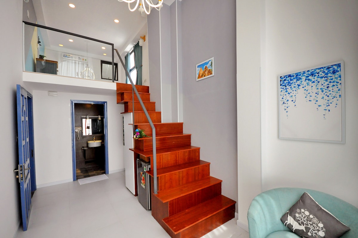 This room is 35m2 (including the upstairs area) and is equipped with full furniture including a private restroom and kitchen set. The utility bills are included in the renting price. The house is next to a cafe and a gym. It is close to the supermarket and market (200m) and the sea (300m). There is a big courtyard in front of the room for parking, BBQ party, and chilling. We also have a small store at the Kiosk of the house selling desserts. You can come to buy good food.