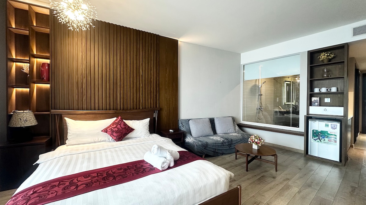 Căn hộ được thiết kế nội thất cao cấp và sang trọng, có sofa dài và có bàn ăn, căn hộ có ban công để ngắm biển và có thể hút thuốc được. Căn hộ có tủ lạnh siêu to, lò vi sóng, đồ dùng bếp cơ bản, máy giặt và Smart TV. Bên dưới căn hộ có 12 tầng trung tâm thương mại các nhà hàng và cafe, có siêu thị Lotte ở tầng 3 và 4, buffet tầng 5, vui chơi trẻ em tầng 7, tiêm chủng VNVC tầng 10. Có hồ bơi vô cực ở tầng 12A và sử dụng với chi phí khoảng 350.000/vé cho 1 khăn tắm, 1 ly nước trong 4 giờ đồng hồ