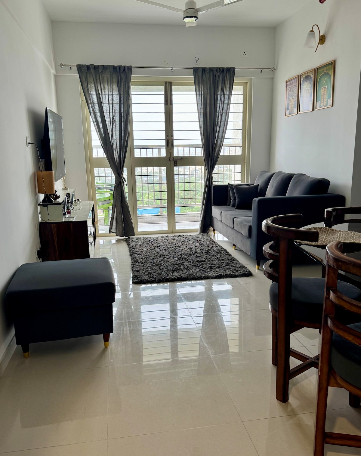 This place is luxurious 1 BHK couple friendly offers modern aesthetics & fully loaded apartment, making it one of the best in Kharadi, Pune. Located just a 5-minute walk from EON IT Park, Barclays, Citi, British Petroleum, & with Magarpatta & Pune International Airpot only 7 km away, it's in a prime spot near cafes, restaurants, shops, public & private transport in Kharadi. Living area features a cozy sofa & Apple TV with OTP channels , Bar unit perfect for relaxing after a day of exploring