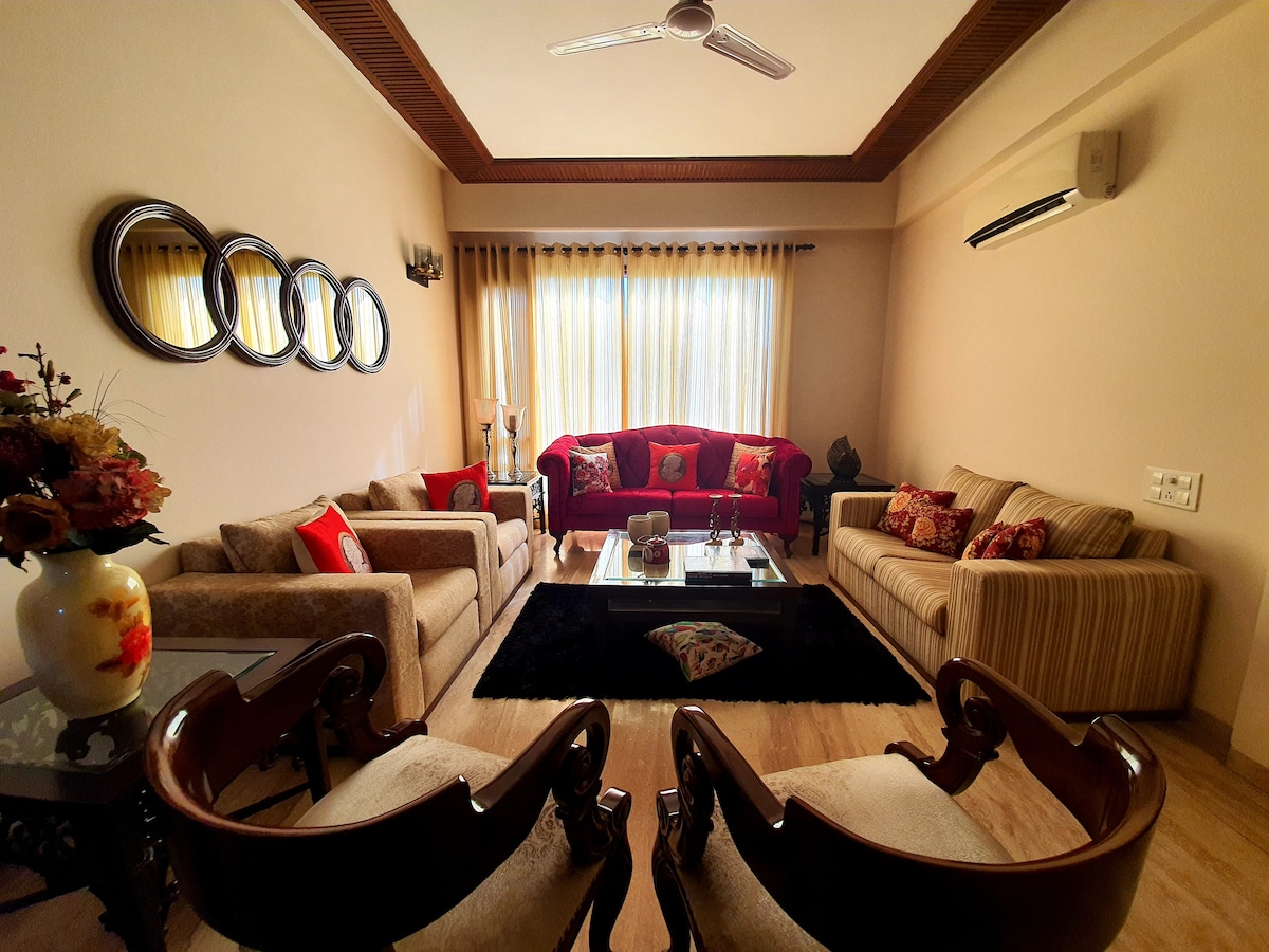 Great One Kanal Villa (First Floor) which is class, and ultra spacious. Extremely well located. All the three bedrooms are extra large and airy, having large balconies, each designed to provide you with ample space and comfort. All three bedrooms have attached closets and bathrooms. Each bedroom comes with a king sized bed, table, chairs, sofa and a king sized sofa cum bed. The living room and dining space is very cozy and huge. Also living room has adequate desk space for office work.