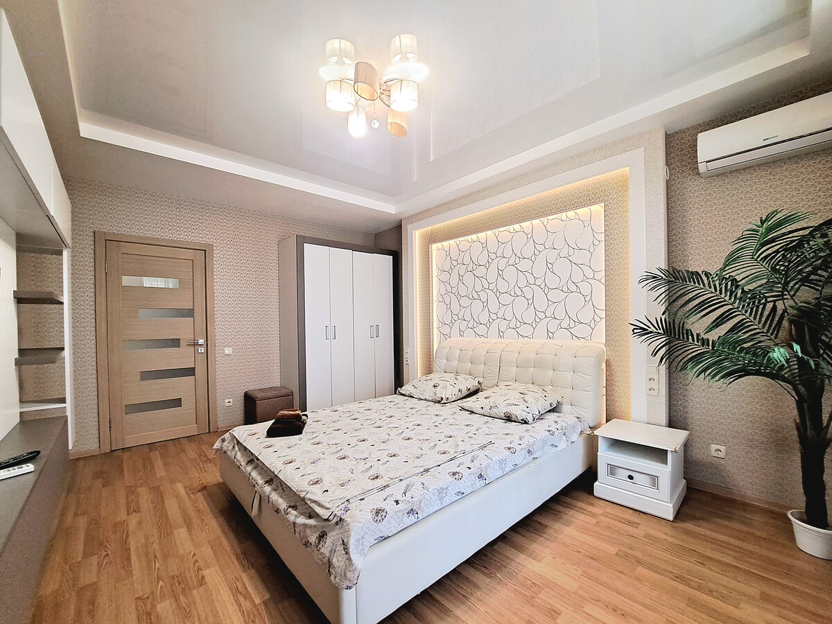 Apartment has new Modern interior with nice view of Manhatten, kitchen, abthroom and balcony with nice view on Lenina prospect, one of the nisest street of Kharkov. Safe entrance door at an entrance. There is metal door in apartment. King size bad an