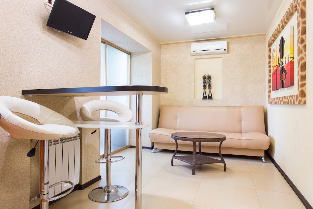 Apartment has new Modern interior with nice view of Manhatten, kitchen, abthroom and balcony with nice view on Lenina prospect, one of the nisest street of Kharkov. Safe entrance door at an entrance. There is metal door in apartment. King size bad an