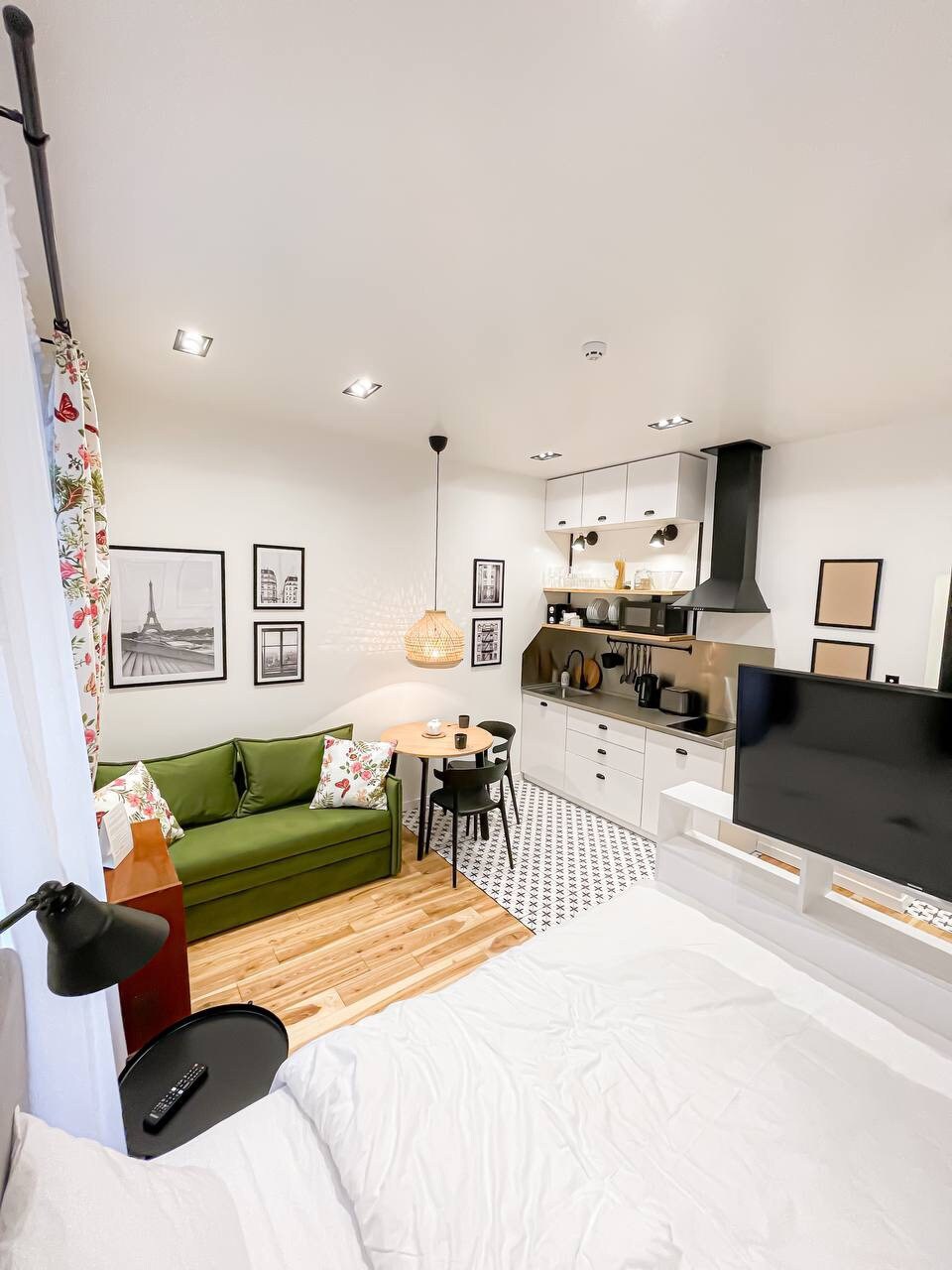 A modern compact studio in the heart of Kharkov at the metro station Sovetskaya. New building next to McDonald's. Well-found full kitchen with built-in oven and touch-sensitive stove. Large closet. Smart TV. High-speed Internet. The bathroom has a shower. Near the house, there are shops, restaurants "Sushi-ya", "Sharikoff", "Panorama Lounge", "DeMarco".