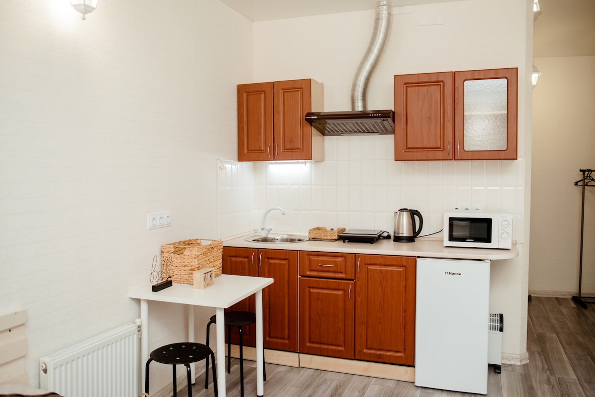 The apartment can comfortably accommodate two adults + one child, in the bright room there is a double bed, a wardrobe/hanger for clothes. The kitchen is equipped with everything you need to prepare delicious meals. The apartments have all the necessary household appliances: LED TV, refrigerator, washing machine, electric kettle, microwave oven, hair dryer, iron, ironing board, necessary dishes, Wi-Fi Internet, linen, towels, slippers, liquid soap, shampoo, tea, drinking water.