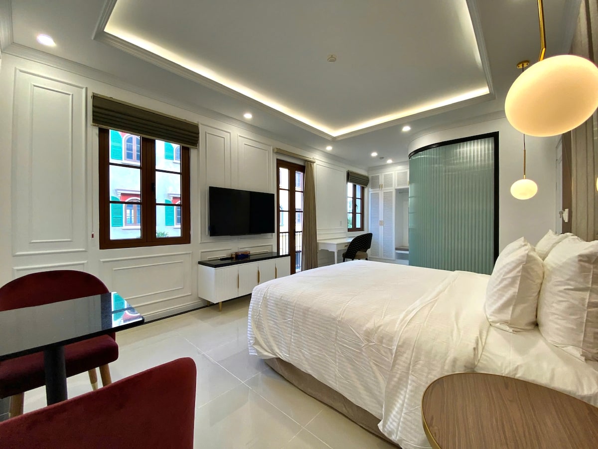 Mellon Oasis, located in the middle of Sunset Town (An Thoi). Address: Positano 91, Khu Sunset Town (Địa Trung Hải), An Thới Our spacious room (40m2) provides guests with a king bed (1.8×2m), 65-ich smart TV, air conditioning, work desk, mini fridge, sofa space, wardrobe, hair dryer, kettle and steam iron. Private bathroom comes with a bath that can fit 2 people and a rain shower.