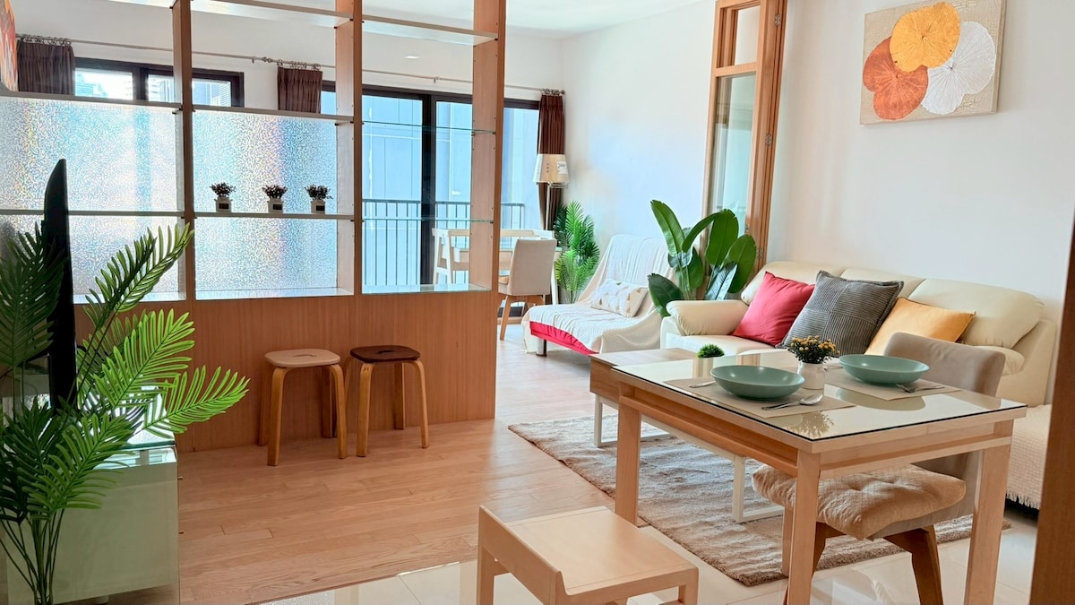 This beautiful Japanese-inspired 55 sqm unit has everything you need for a pleasant stay. The bedroom king-sized bed and personal workspace, and opens onto a spacious semi-outdoor bathroom with a wooden ofuro tub that fits two, and leads to a large walk-in closet. The living room includes a cozy sofa bed and a Ultra HD Smart TV. The kitchen is well-equipped with a microwave, range-hood, electric hob and refridgerator. The large picture window offers a view of the gardens and swimming pool.