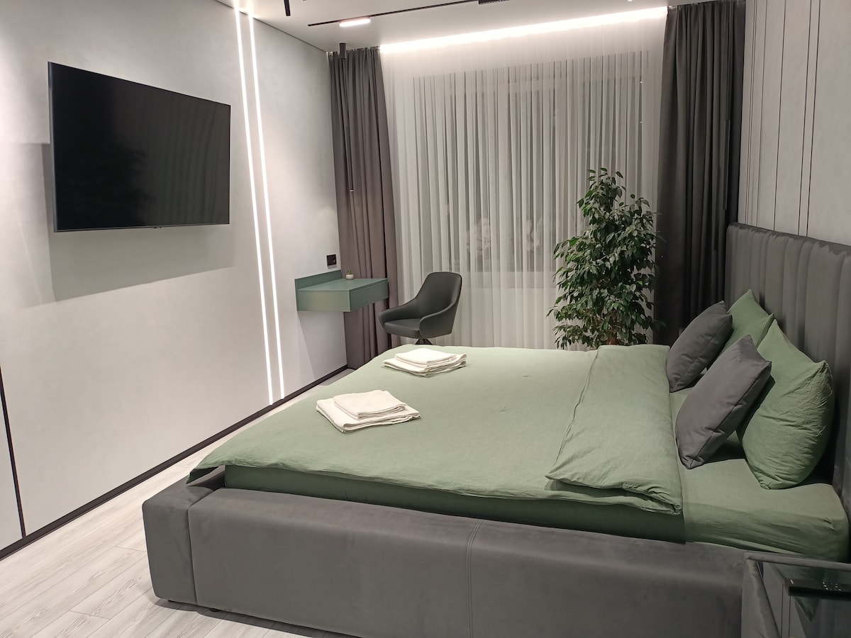 Видова Квартира у новому сучасному будинку.Простора затишна спальня з вбудованою шафою купе,кондиціонером і телевізором.Велика кухня з панорамними вікнами,яка додатково укомплектована диванчиком для відпочинку. Є балкон для паління.В квартиріє всі необхідні речі для комфортного проживання-праска,пральна машинка,дочка для прасування,сушилка для білизни,фен.Заселення можливо в будь-який час,навіть вночі.Можливе заселення з домашніми тваринами.Поруч супермаркети,зручна транспортна розвʼязка