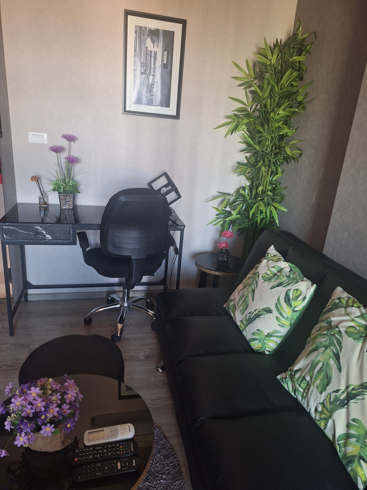 ห้องแต่งสวย เฟอร์นิเจอร์และเครื่องใช้ไฟฟ้าครบ มีที่จอดรถ เฟอร์นิเจอร์ : เตียงพร้อมที่นอน พร้อมชุดเครื่องนอนโซฟาเบดพร้อมโต๊ะกลาง เคาท์เตอร์ครัว ตู้เสื้อผ้า โต๊ะเครื่องแป้ง พร้อมเก้าอี้สตูล เครื่องใช้ไฟฟ้า : ทีวี 32'' ตู้เย็น ไมโครเวฟ เครื่องทำน้ำอุ่น เครื่องซักผ้า แอร์ สิ่งอำนวยความสะดวก – ห้องออกกำลังกาย – สวนสีเขียว – ห้องสมุด – ระบบ CCTV / Access Card
