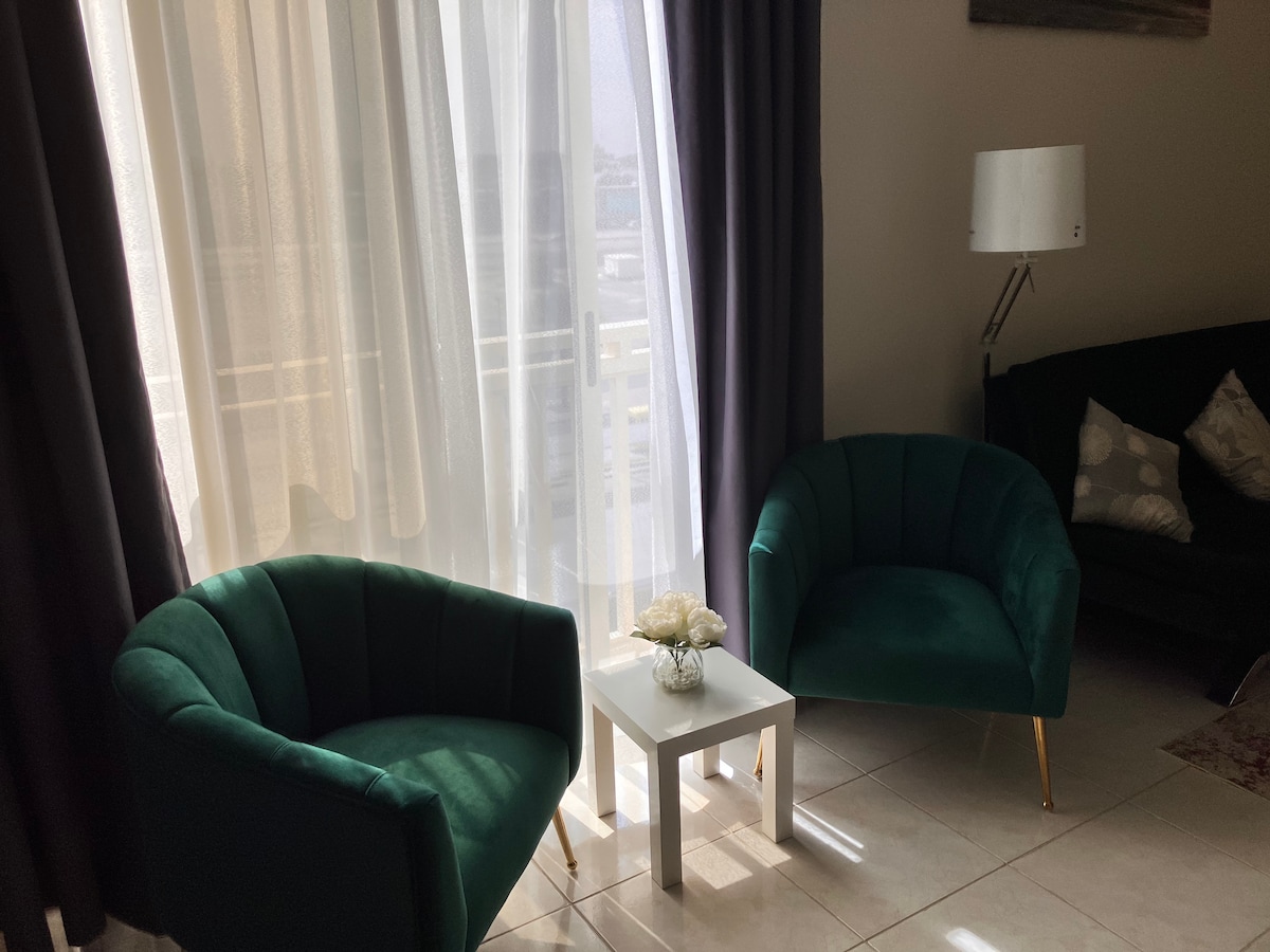 My apartment has 1 room with a king bed for 2 people, and a room with a twin bed for 2 people, and 1 small room with a small bed for 1 person, all rooms include a bathroom, and one bathroom is available in the living room, it includes comfortable sofas. In addition a pantry is available with all needed cooking and serving equipments. My Apartment is a part of The Adress Fujairah Hotel, Alaqah. My apartment is on the ground floor where you can enjoy the balcony