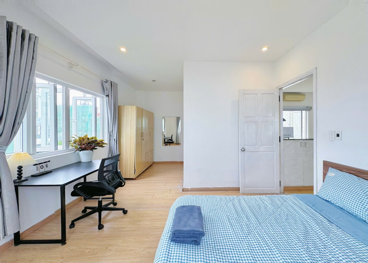 Experience Da Nang from above in this bright and elegant 4th floor studio. Enjoy wide city views from your private balcony and plenty of natural light from large windows. The space feels open and peaceful, blending minimalist design with cozy comfort. A spacious workstation with a comfortable chair sits by the window, giving you a calm and inspiring place to read, work, or simply enjoy the breeze. Perfect for travelers seeking calm, modern living close to the city’s energy.