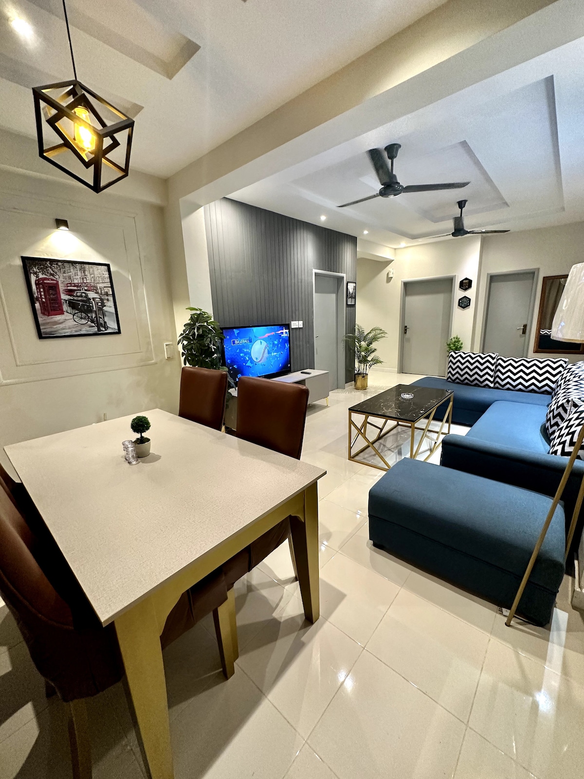 Luxury 2BHK in Zeta Mall | Giga Mall & Margalla Views - Spacious 1725 sq ft 2-bedroom condo with two king beds and a private balcony with outdoor seating. - 55" Smart TV and 30 Mbps Wi-Fi for work or streaming. - Fully equipped kitchen, inverter ACs, hot water and modern décor for a seamless stay. - Located above Zeta Mall Food Court, steps from Giga Mall, minutes to DHA and the Expressway. - Perfect for families and business travelers. - CNIC required 18+. No smoking or parties. Book Now!