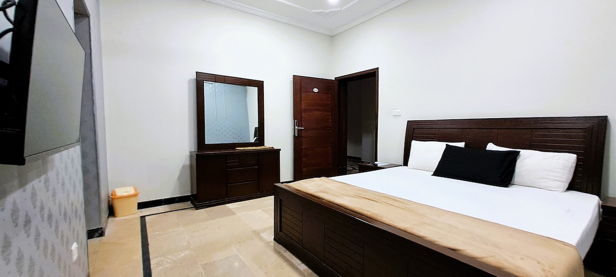 Stay in the center of city with easy access to all areas with all things available on footstep. Feel like your home, stay like you own and wish to be here again and again. Its a fully furnished bungalow where more then one two rooms are available for families and tourists plus car rental is also available. Staff is also available here 24hrs, everything is available 24hr.