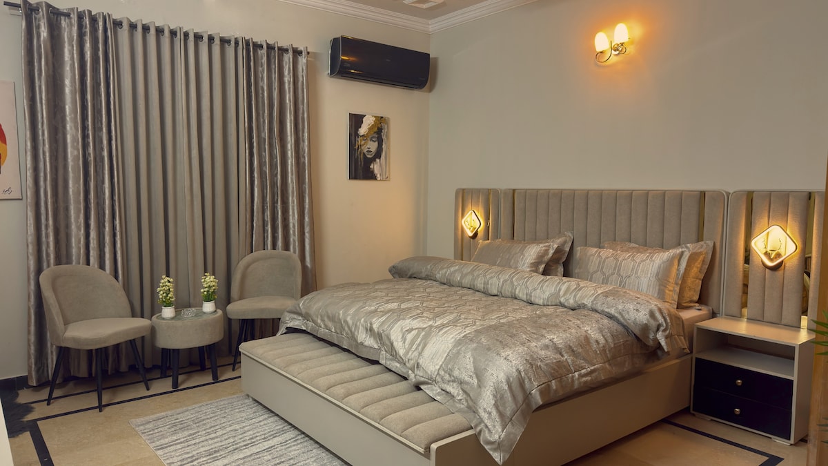 Modern & stylish deluxe room in the heart of Islamabad. Enjoy a cozy private space with a Smart TV installed in the room, fast Wi-Fi, and AC. The kitchen, drawing room, and dining area are shared, keeping a friendly, family environment. Located in peaceful G-13 near metro, shops & cafés. Perfect for families, couples, or business travelers seeking comfort, cleanliness & modern vibes. Free parking & tea setup included.